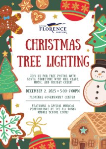 Kick off the holiday season with the City of Florence at our annual Christmas Tree Lighting Celebration on December 2, 2025, held at the Florence Government Center. This free, family-friendly event begins at 5:00 PM and will feature activities and entertainment for all ages.