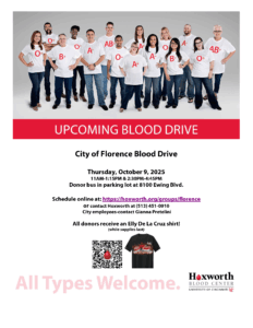 The City of Florence is excited to announce a blood drive scheduled for Thursday, October 9, 2025. This event will take place at the Florence Government Center, 8100 Ewing Blvd., Florence, Kentucky, with the donor bus stationed in the parking lot.