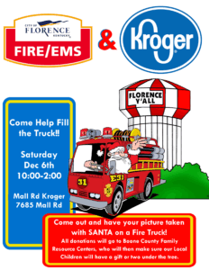 The City of Florence Fire/EMS Department, in partnership with Kroger, is filling the truck with donations for the Boone County Family Resource Centers on Saturday, December 6, from 10:00 a.m.- 2:00 p.m. Stop by Kroger in Florence at 7685 Mall Road and consider making a donation of toys or hygiene products including soap, shampoo, deodorant, toothpaste, etc.